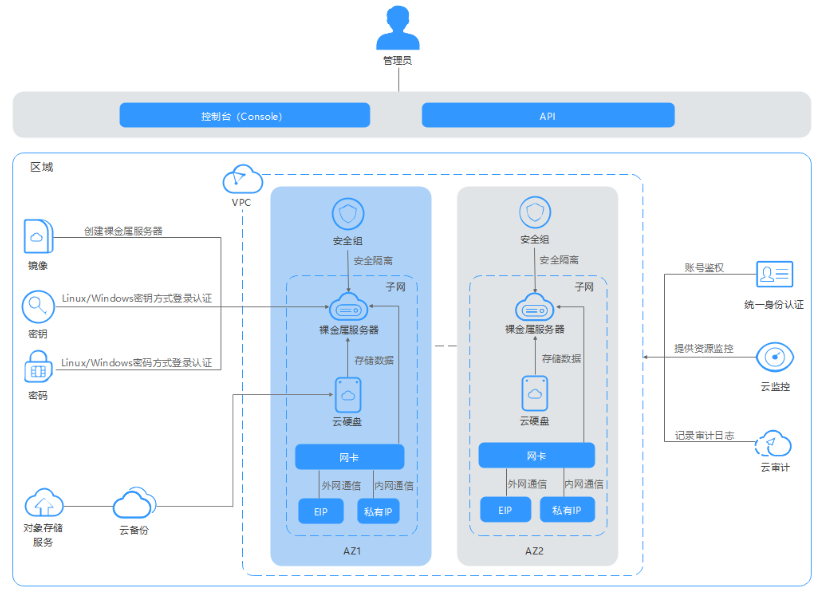 通过和其他服务组合,裸金属服务器可以实现计算、存储、网络、镜像安装等功能: